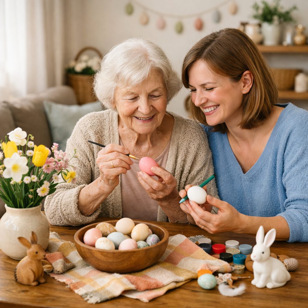 Auch mit Familienmitgliedern, die nicht mehr alles selbst machen können, kann gemeinsames Basteln rund um Ostern eine schöne Beschäftigung sein. So bleiben alte Traditionen lebendig, und es entstehen oft ganz nebenbei gute Gespräche.