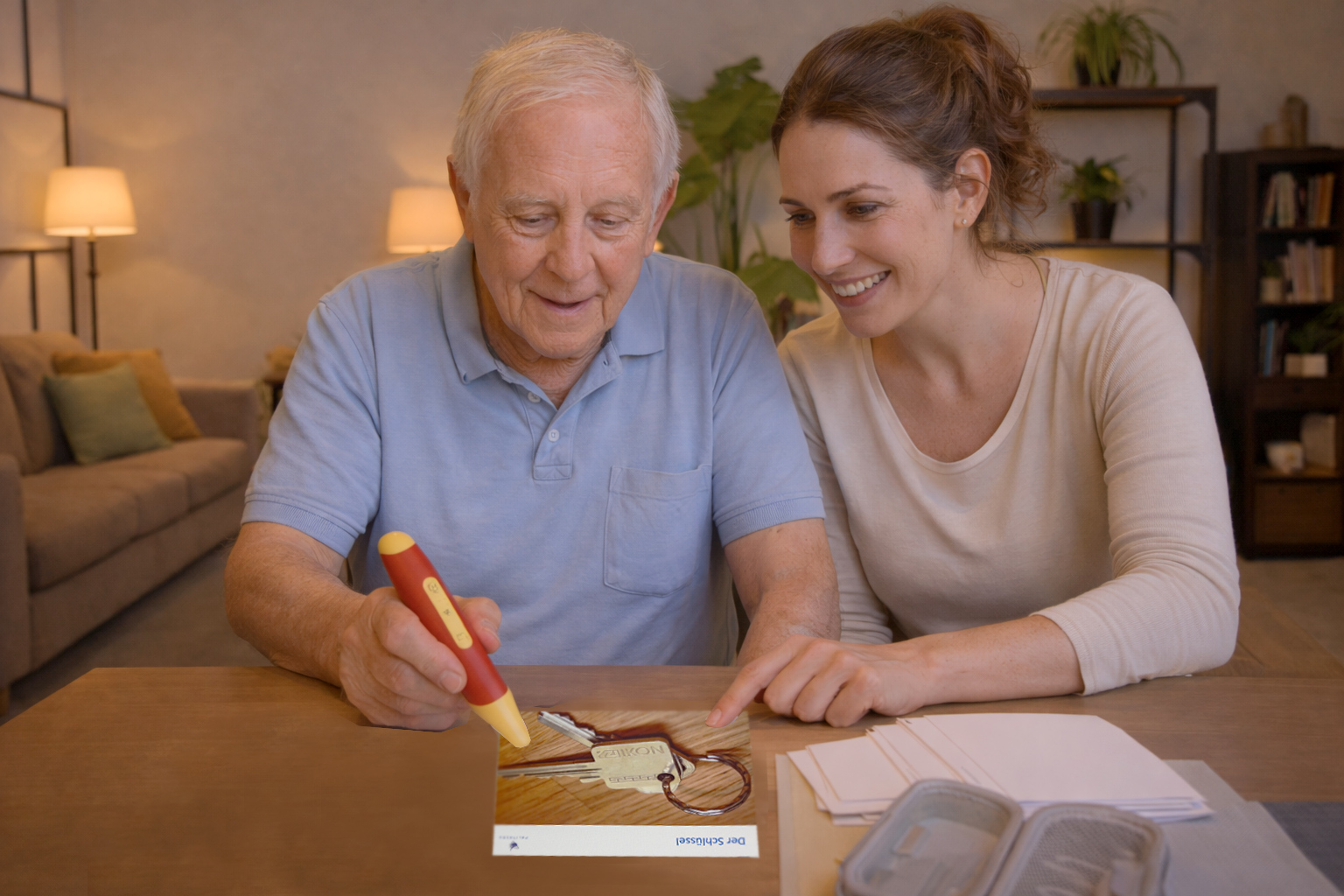 Der Sprechbild Hörstift® ist ein intelligenter audiogesteuerter Stift zur Förderung von Sprache, Gedächtnis und Aufmerksamkeit. Durch einfaches Berühren von Bildkarten werden Wörter, Anweisungen und Übungen hörbar.